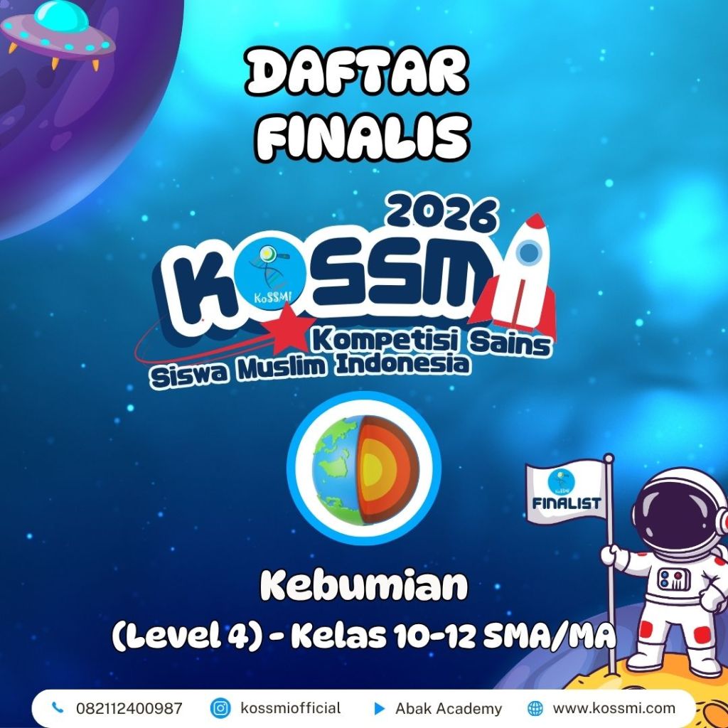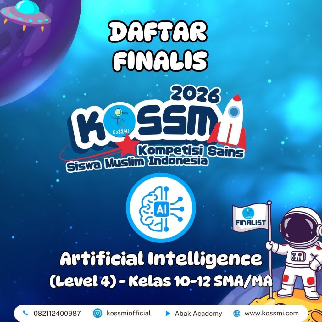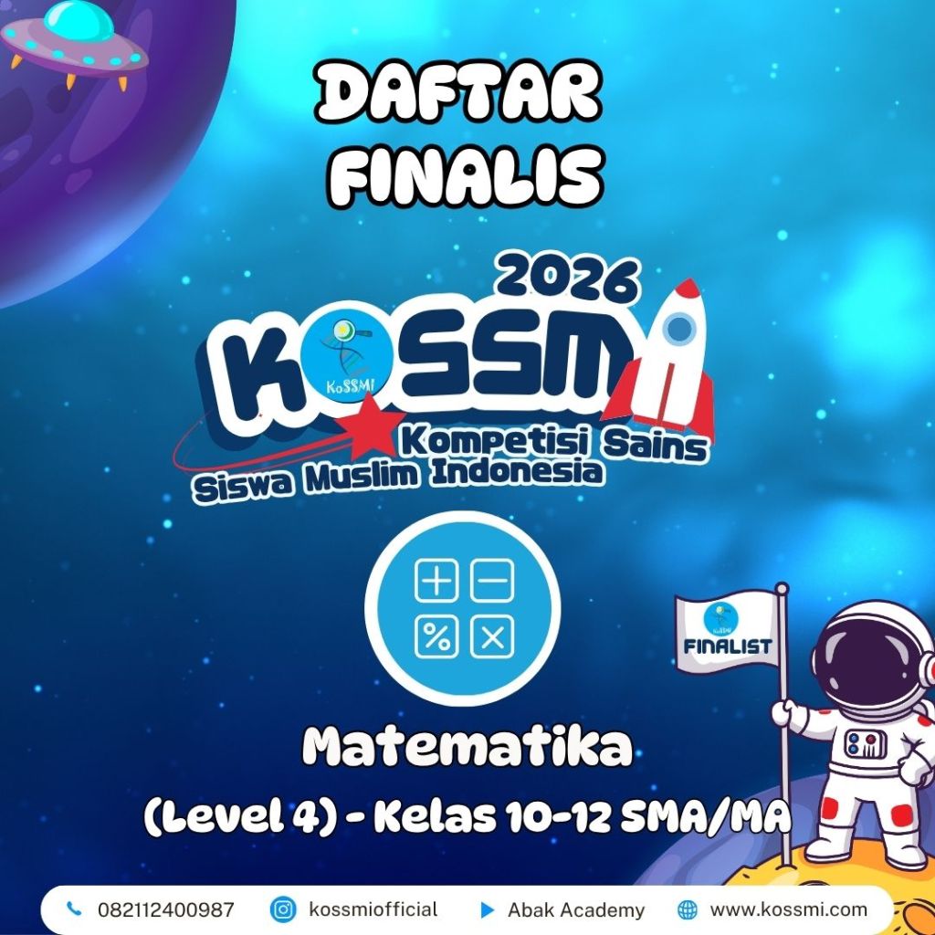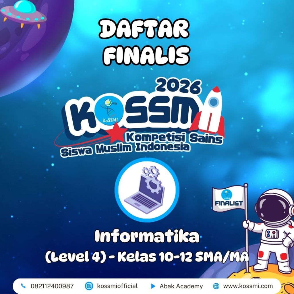 Daftar Finalis Jenjang SMA/MA KoSSMI 2026 Daftar Finalis Matematika Level 4 Daftar Finalis Kimia Level 4 Daftar Finalis Fisika Level 4 Daftar Finalis Biologi Level 4 Daftar Finalis Ekonomi Level 4 Daftar Finalis Geografi Level 4 Daftar Finalis Informatika Level 4 Daftar Finalis Astronomi Level 4 Daftar Finalis Kebumian Level 4 Daftar Finalis Artificial Intelligence Level 4