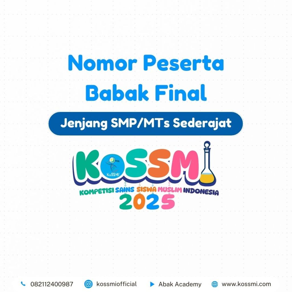 Nomor Peserta Finalis KoSSMI 2025 – Jenjang SMP/MTs Sederajat Matematika – (Level 3) – Kelas 7-9 SMP/MTS Ilmu Pengetahuan Alam – (Level 3) – Kelas 7-9 SMP/MTS Ilmu Pengetahuan Sosial – (Level 3) – Kelas 7-9 SMP/MTS