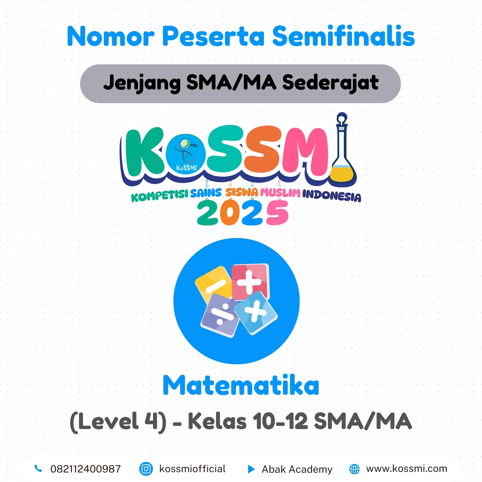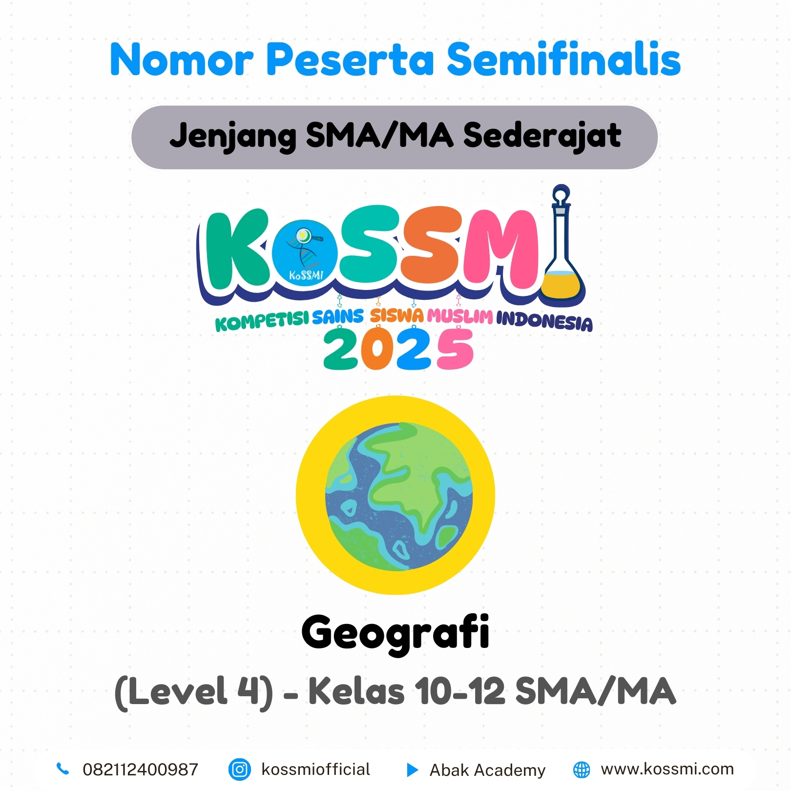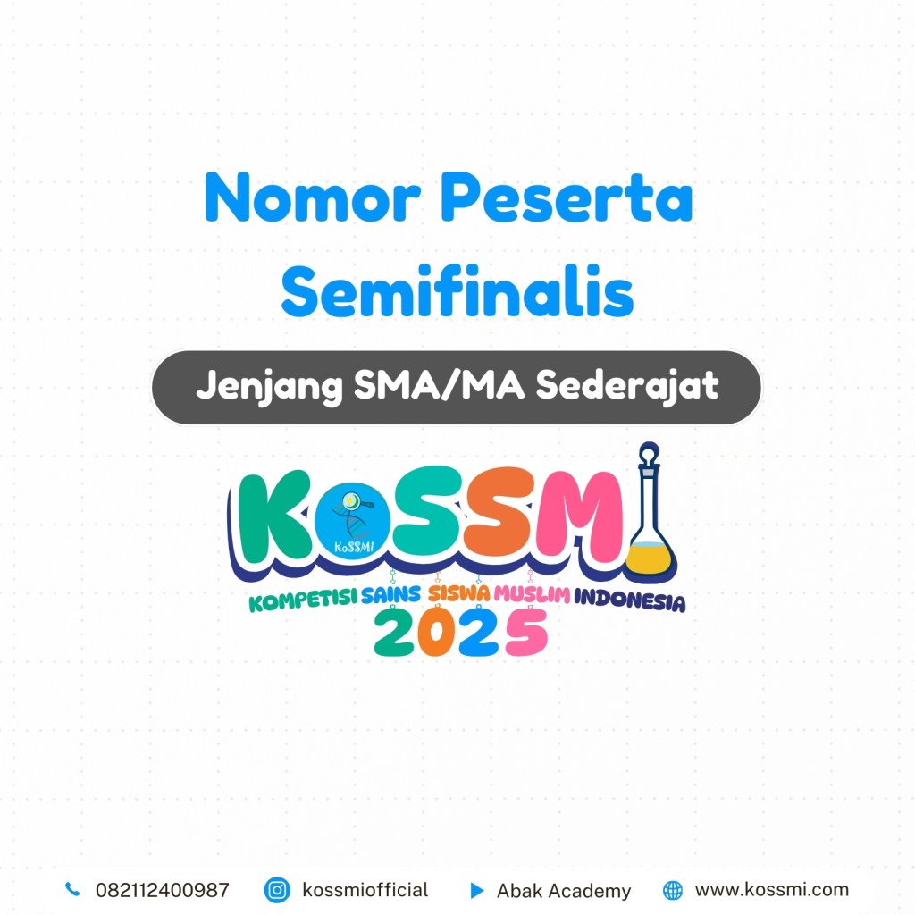 Nomor Peserta Semifinalis KoSSMI 2025 – Jenjang SMA/MA Sederajat Matematika – (Level 4) – Kelas 10-12 SMA/MA Kimia – (Level 4) – Kelas 10-12 SMA/MA Fisika – (Level 4) – Kelas 10-12 SMA/MA Biologi- (Level 4) – Kelas 10-12 SMA/MA Ekonomi – (Level 4) – Kelas 10-12 SMA/MA Geografi – (Level 4) – Kelas 10-12 SMA/MA