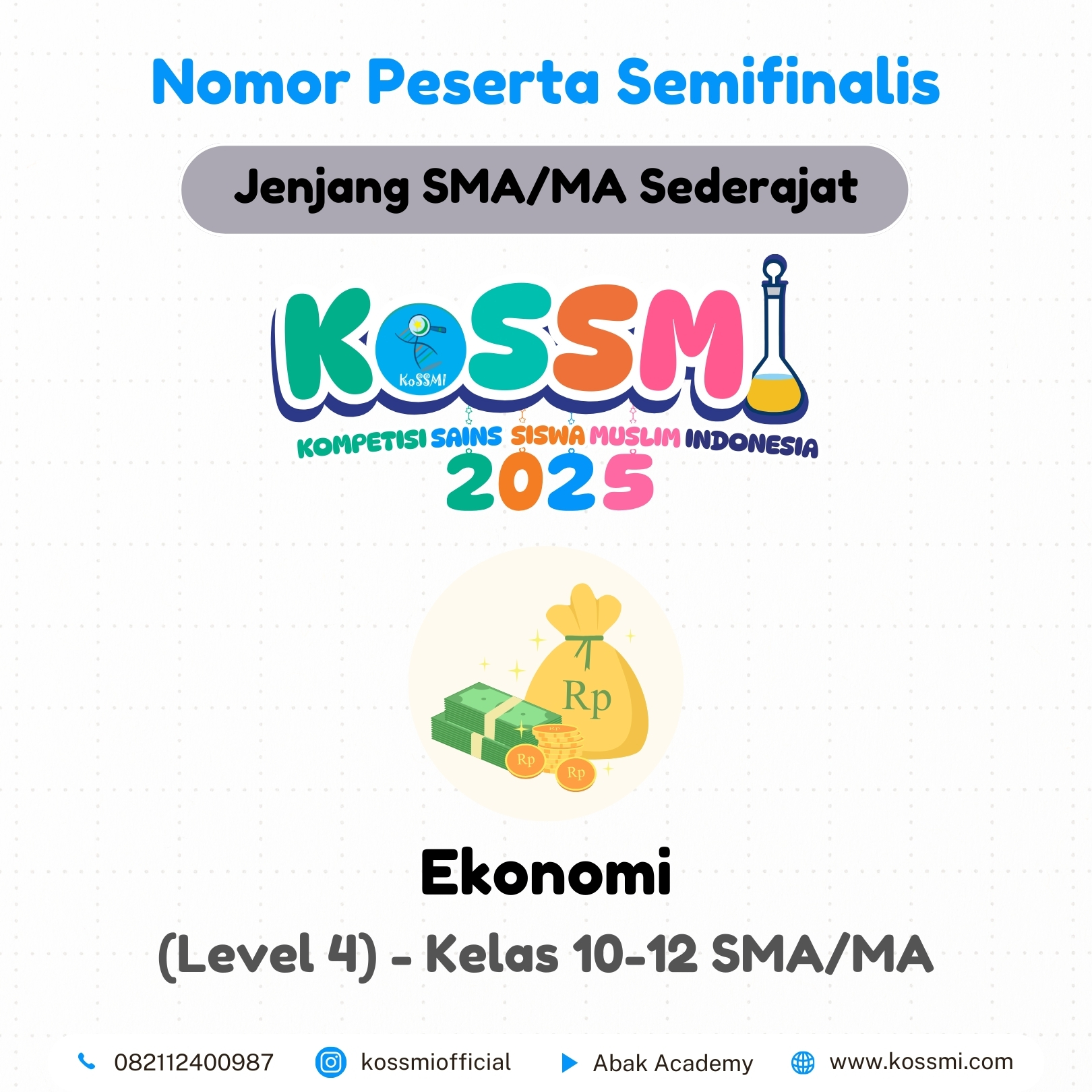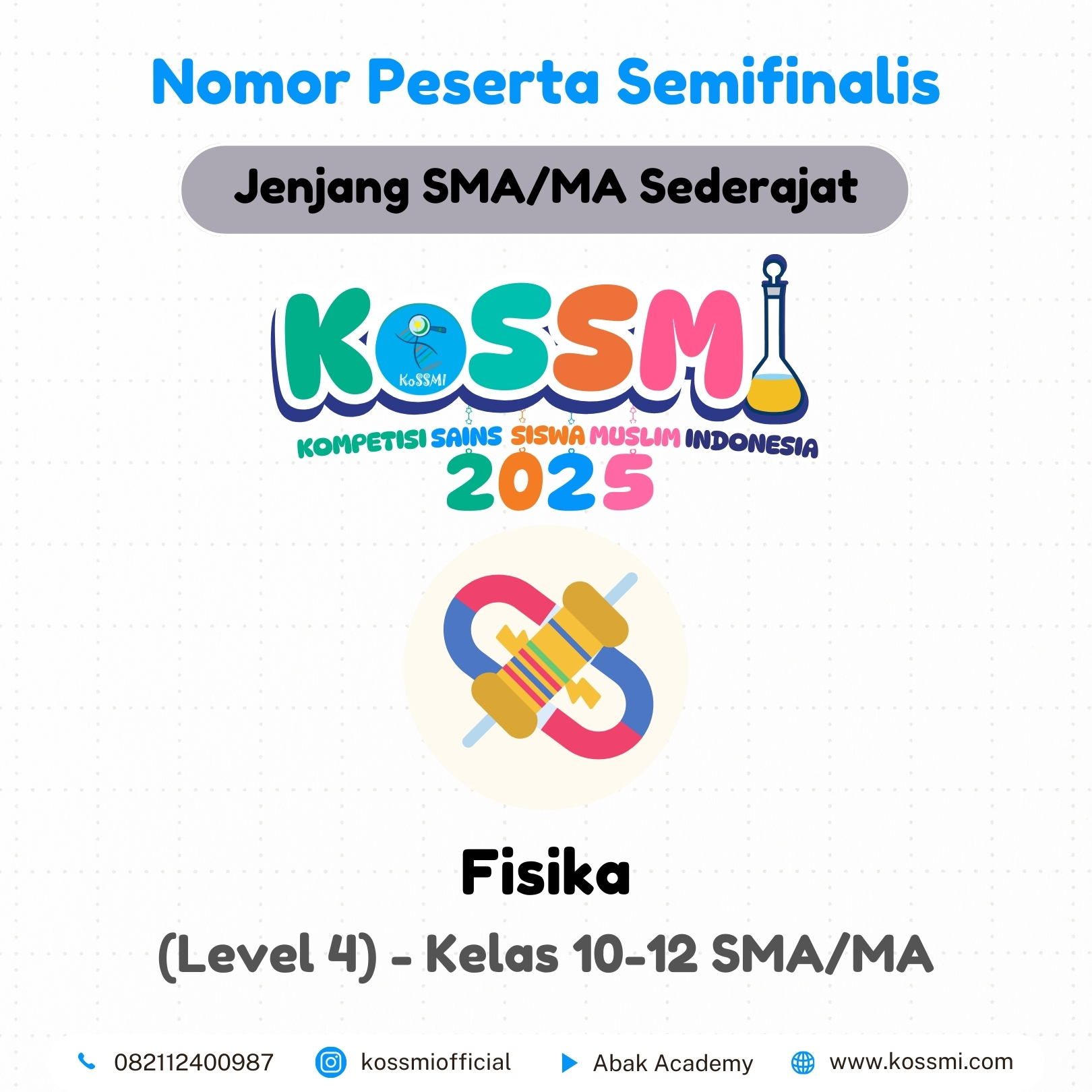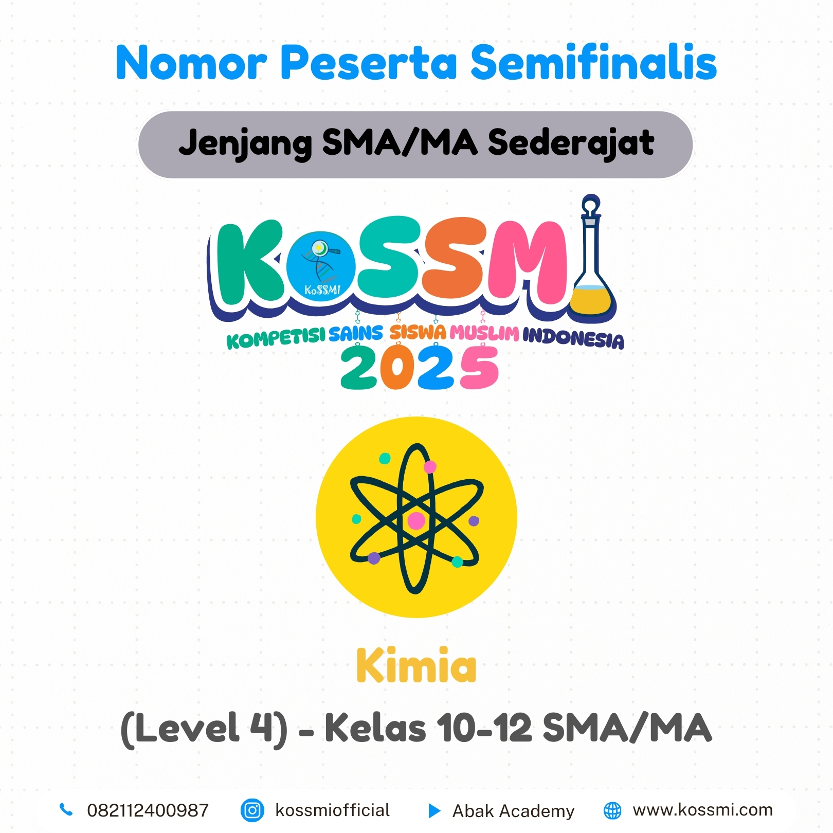 Nomor Peserta Semifinalis KoSSMI 2025 – Jenjang SMA/MA Sederajat Matematika – (Level 4) – Kelas 10-12 SMA/MA Kimia – (Level 4) – Kelas 10-12 SMA/MA Fisika – (Level 4) – Kelas 10-12 SMA/MA Biologi- (Level 4) – Kelas 10-12 SMA/MA Ekonomi – (Level 4) – Kelas 10-12 SMA/MA Geografi – (Level 4) – Kelas 10-12 SMA/MA