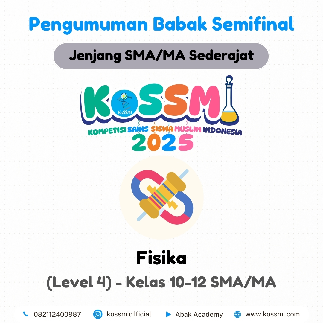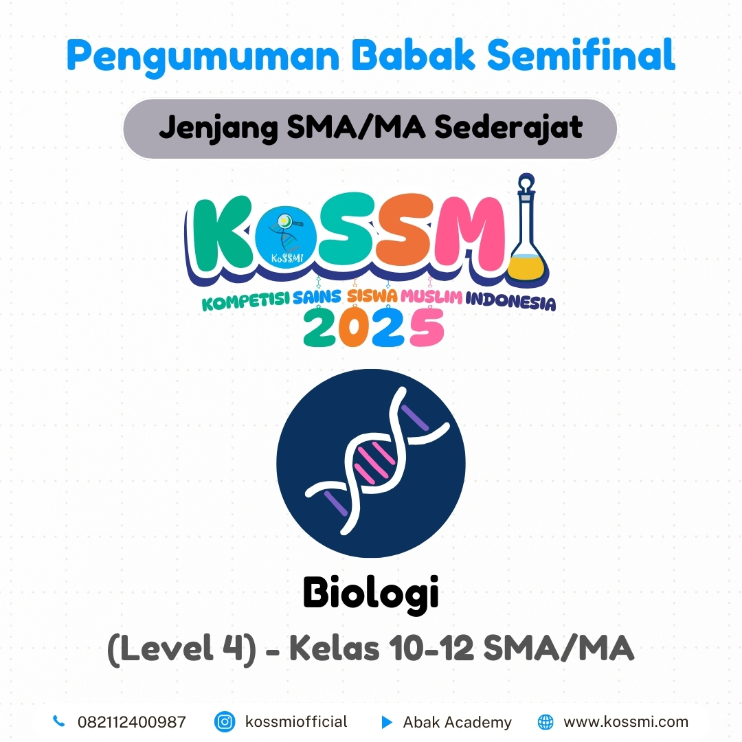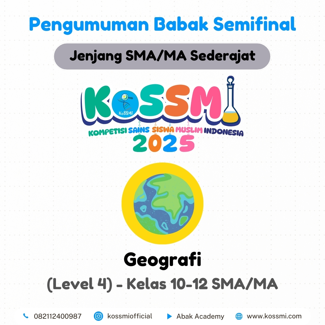 Pengumuman Babak Semifinal SMA/MA KoSSMI 2025 Matematika – (Level 4) – Kelas 10-12 SMA/MA Kimia – (Level 4) – Kelas 10-12 SMA/MA Fisika – (Level 4) – Kelas 10-12 SMA/MA Biologi- (Level 4) – Kelas 10-12 SMA/MA Ekonomi – (Level 4) – Kelas 10-12 SMA/MA Geografi – (Level 4) – Kelas 10-12 SMA/MA