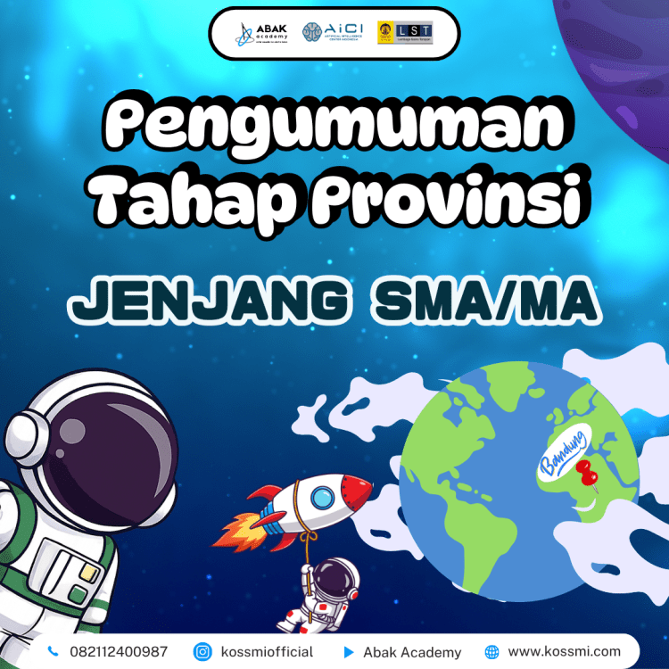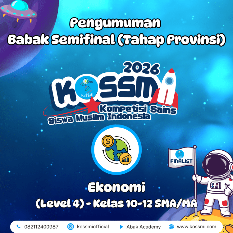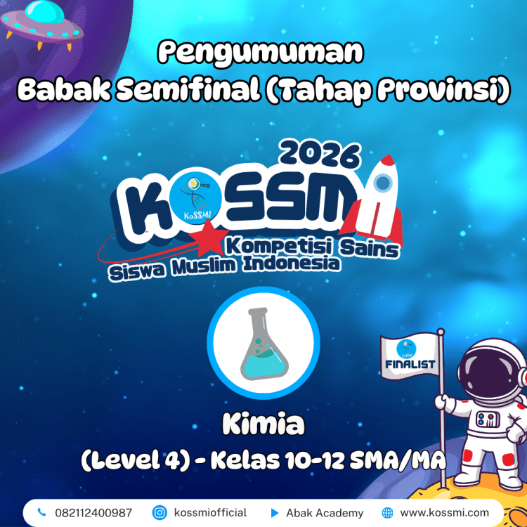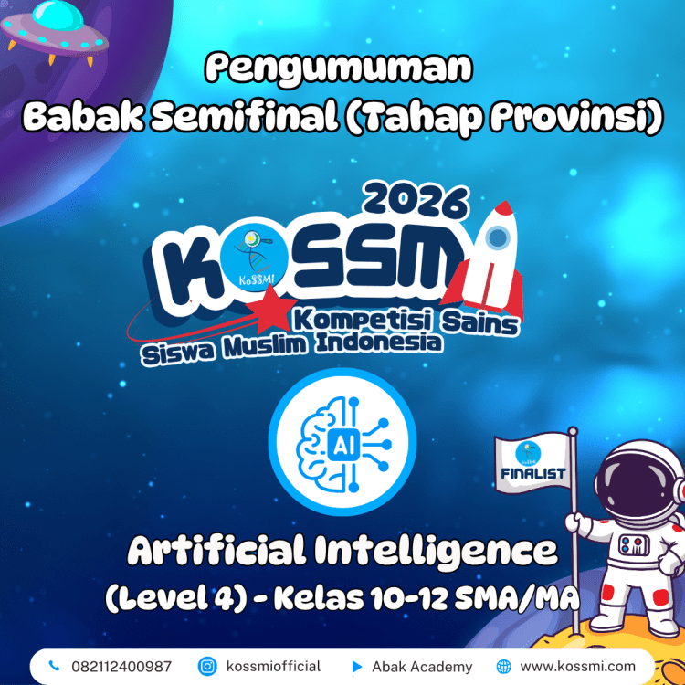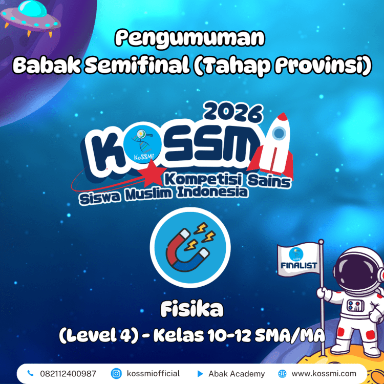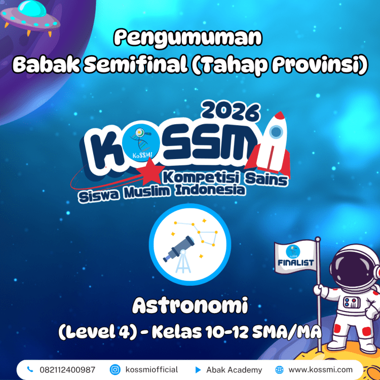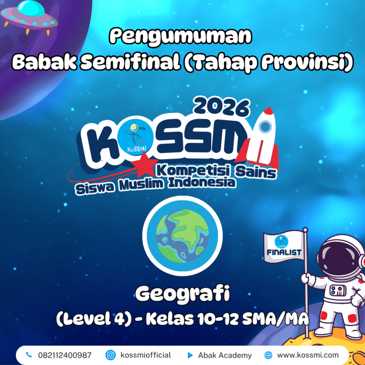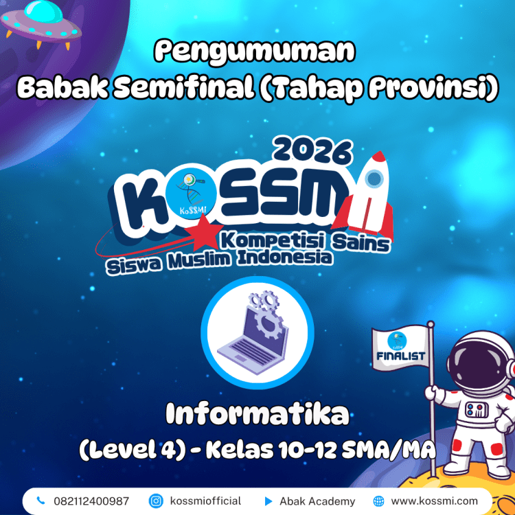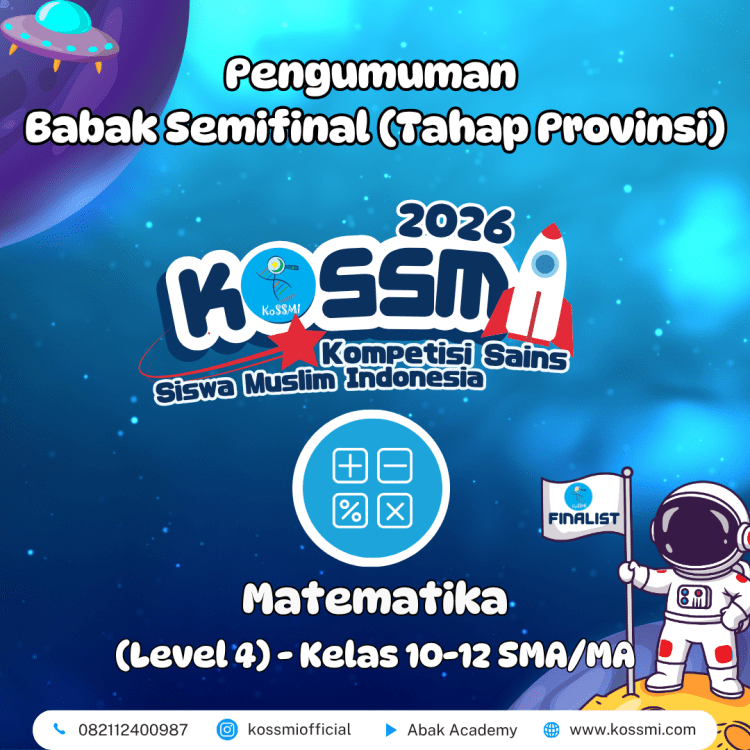 Pengumuman Tahap Provinsi SMA/MA KoSSMI 2026 Pengumuman Matematika Level 4 Pengumuman Kimia Level 4 Pengumuman Fisika Level 4 Pengumuman Biologi Level 4 Pengumuman Ekonomi Level 4 Pengumuman Geografi Level 4 Pengumuman Informatika Level 4 Pengumuman Astronomi Level 4 Pengumuman Kebumian Level 4 Pengumuman Artificial Intelligence Level 4